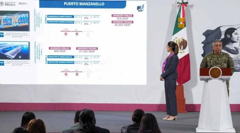 Manzanillo, dijo, “se convertirá en el primer puerto de América Latina”. Para ello se trabaja, por ejemplo, en la reubicación de la terminal de Pemex, para lo que dedicará una inversión de 994 millones de pesos. La obra tiene un avance de 30 por ciento y estará lista en octubre de 2027.